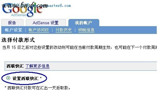 当然,现在除了用邮寄支票的方法,还可以在google帐户后台选择用“西联汇款”,由于收款快、而且免费,所以收到站长的欢迎。开通西联帐号后,国内一般都和农行、邮局办理,具体操作问银行工作人员就可以了,和上面的中行是一样的。