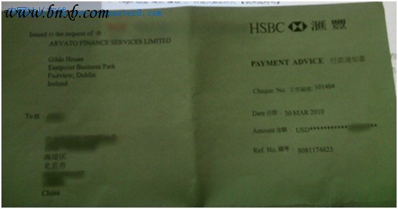 (google寄来的支票,国内一般都通过香港汇丰银行)