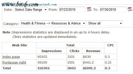 比Google Adsense更好的是目前BidVertiser没有限制一个页面放多少个广告条,而且会自动挑选价格高的更高展示在你的网站上,也许比Google Adsense的广告费还高,我的目前能维持在平均0.3$上,一会儿上图说明。
