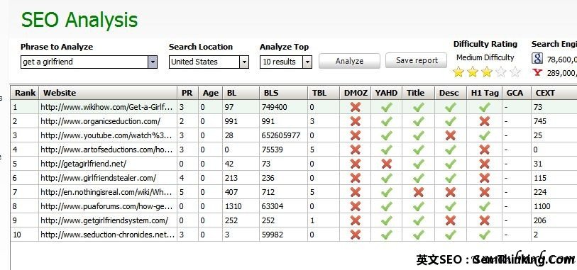 分析站内因素时,我们使用SEO Analysis – Analyze keyword就行了,这里以“get a girlfriend”这个词为例: