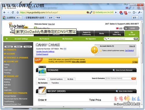 当注册好GoDaddy帐号后,我们就准备要把网址加入到GoDaddy进行管理,换句话说就是把网址的DNS设定转移到GoDaddy来,以后我们管理网址的DNS设定就都在这边就可以了。