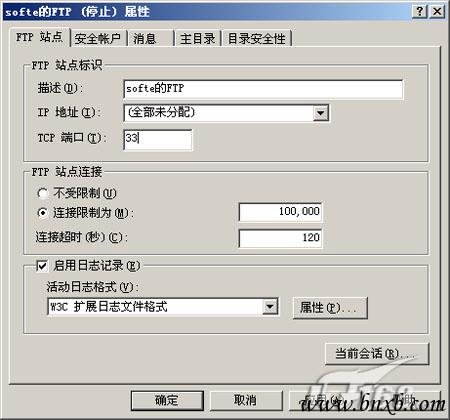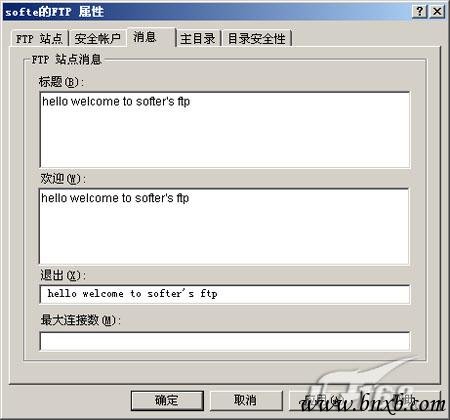 第一步:如果你觉得登录FTP服务器显示的信息比较乏味的话还可以通过“站点属性”的“消息”标签来自定义一个欢迎信息和退出通告信息。(如图32)