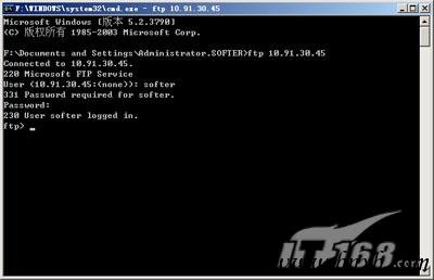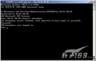 第三步:我们在另外一台连接了网络的计算机上通过“开始->运行->输入CMD”进入命令行模式来检测FTP工作状态。当然如果你有其他FTP客户端登录工具的话使用他们来检测是更加方便的。在命令行模式中输入ftp 10.91.30.45后回车,该IP为建立FTP服务的服务器IP地址。在出现USER提示时输入10.91.30.45计算机上管理员名称,在接下来的PASSWORD处输入系统管理员的密码就可以登录了。(如图28)