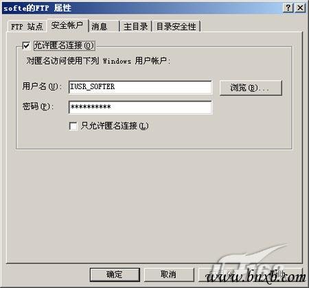 第二步:在FTP属性窗口中的“安全帐户”标签我们可以设置该FTP是否容许匿名登录,或者选择匿名登录使用的帐户。(如图27)