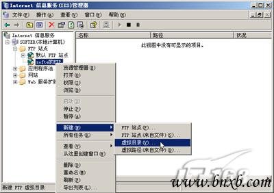 第一步:通过任务栏的“开始->所有程序->管理工具”,再其下找到Internet信息服务(IIS)管理器,打开管理器在任意一个FTP站点上点鼠标右键选择“新建->虚拟目录”。(如图38)