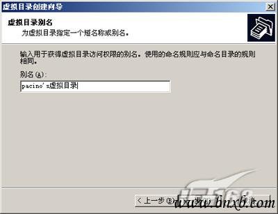 第三步:在虚拟目录别名设置窗口中为建立的虚拟目录起一个名称,这个名字非常重要。如果我们的IP地址为10.91.30.45,虚拟目录名为softer的话,那么如果要访问该FTP虚拟目录发布的主目录的话需要输入ftp://10.91.30.45/softer才行。因此别名是非常重要的,需要我们牢记。(如图40)