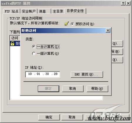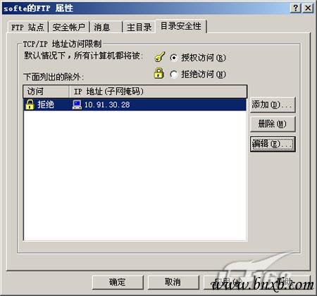 第三步:同样是在“站点属性”的“目录安全性”标签,我们可以设置容许和拒绝访问该FTP服务器的IP地址范围。(如图34)操作起来很简单这里就不详细讲解了,所设置的拒绝访问地址信息都会清晰的出现在地址列表中。(如图35)