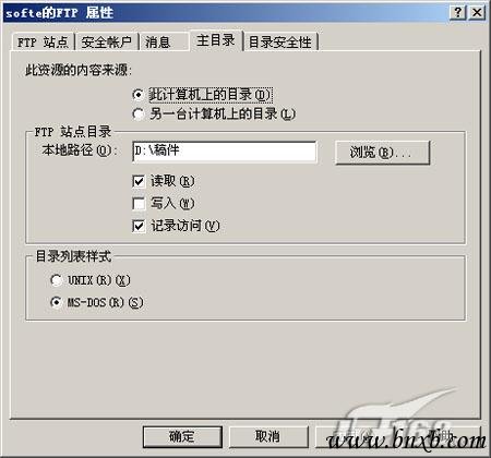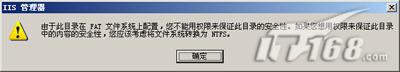 小提示:如果发布FTP资源的目录在NTFS文件格式的磁盘上的话则可以通过相应的用户访问权限来设置了。如果是其他格式例如FAT32的话则权限是无法设置的,会出现错误提示。(如图37)