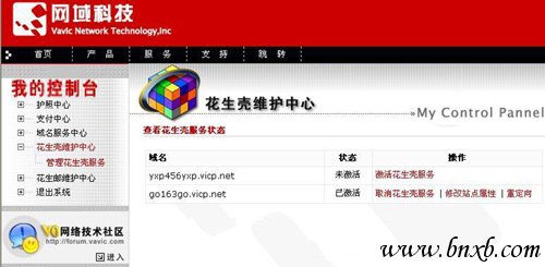 在花生壳客户端的菜单栏选择“控制→我的控制台”,在打开的网页表单上填入网域护照和密码,登录到“我的控制台”,在这里你可以修改个人资料,申请免费域名等操作。刚申请的域名不能立即使用,还必须激活。在“我的控制台”的“花生壳维护中心”,左键单击“管理花生壳服务”,在新打开的页面中会列出已激活和未激活的域名(图)。对于未激活的域名,左键单击“激活花生壳服务”,根据提示,填写你的站点分类、站点描述等信息后,该域名就会被激活。