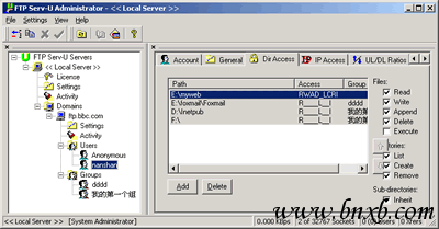 ⑶设置“Dir Access”(目录存取权限):在此处选“Add”(增加)增加目标目录(可多个),然后再为它们逐个设置存取权限。本项具体设置请参见本教程后文相关内容。