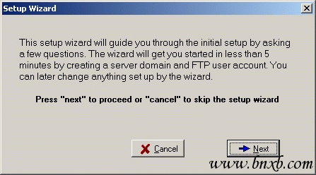 2、打开Serv-U管理器。选上图的“Serv-U Administrator”,即出现“Setup Wizard”(设置向导)。此向导可以帮你轻松地完成基本设置,因为建议使用它。直接选“Next”(下一步)。如下图: