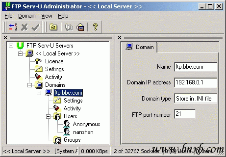 4、从上图中可以看到,现在已经建立好了一个FTP服务器,服务器地址为“ftp.bbb.com”,其下有两个用户,一个是匿名用户“Anonymous”,其密码为空;一个是普通用户“nanshan”,其密码为在向导中输入的内容。