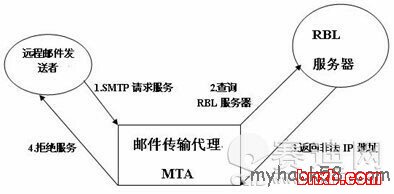 (3)实时黑名单过滤:前面介绍的防范措施对使用自身合法域名的垃圾邮件无效,这时可以使用黑名单服务列表。针对每个进入的邮件信息,MTA程序获取远程服务器的地址,并且查询远程互联网服务器对该地址进行认证。如果该地址在垃圾邮件主机列表中,则MTA拒绝接受这些邮件信息。其中使用BRL认证过程如图1所示。