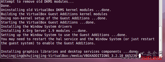 5.终端中输入命令:sudo ./VBoxLinuxAdditions-x86.run,开始安装增强功能,注意上述命令仅适于32位系统,64位系统请选择相应的命令,安装过程及安装完成后终端的输出见下图,