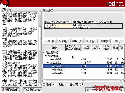 自动分区包含三个选项:删除系统内所有的Linux分区、删除系统内的所有分区和保存所有分区使用现有的空闲空间.由此看来这项选择不适合我的需要,我的硬盘有4个分区,而第一个分区已安装了Windows 98,我想保留它装双系统.于是点击“上一步”返回到图11所示画面后再重新选择“用Disk Druid手工分区”,点击“下一步”显示如下图13