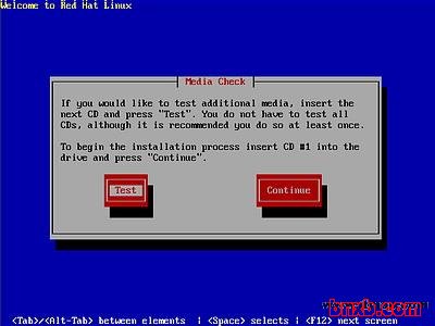 选择“Continue”并回车开始安装.假如你想测试余下的2张安装CD,请放入下一张安装CD到光驱中,并选“Test”后回车即开始测试,完成后再次出现图4画面表示通过测试,再按回车键后又出现图5所示,重复步骤直到完成全部安装CD的测试.全部安装CD的测试完成后,用“向右箭头键”选择“Continue”并放入第一张安装CD到光驱后回车,安装程序开始检测计算机外围硬件设备,接着出现如下图6