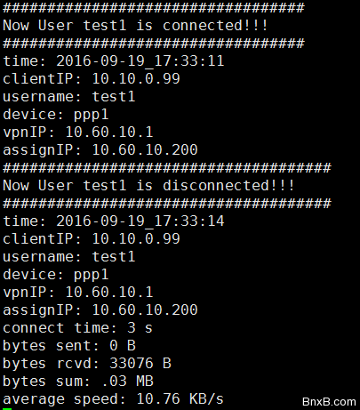 #!/bin/sh LOG_DIR="/var/log/pptpdlog" curDay=`date +"%Y%m%d"` logFile="${LOG_DIR}/pptpd${curDay}.log" echo "#####################################" >> $logFile echo "Now User $PEERNAME is disconnected!!!" >> $logFile echo "#####################################" >> $logFile echo "time: `date -d today +%F_%T`" >> $logFile echo "clientIP: $6" >> $logFile echo "username: $PEERNAME" >> $logFile echo "device: $1" >> $logFile echo "vpnIP: $4" >> $logFile echo "assignIP: $5" >> $logFile echo "connect time: $CONNECT_TIME s" >> $logFile echo "bytes sent: $BYTES_SENT B" >> $logFile echo "bytes rcvd: $BYTES_RCVD B" >> $logFile sum_bytes=$(($BYTES_SENT+$BYTES_RCVD)) sum=`echo "scale=2;$sum_bytes/1024/1024"|bc` echo "bytes sum: $sum MB" >> $logFile ave=`echo "scale=2;$sum_bytes/1024/$CONNECT_TIME"|bc` echo "average speed: $ave KB/s" >> $logFile