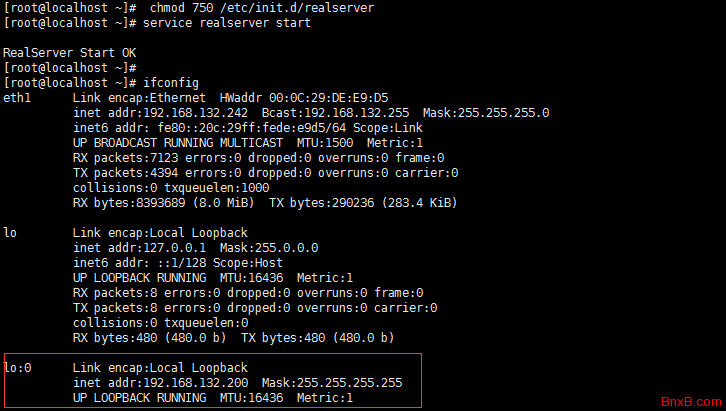 exit 0 #表示进程非正常退出#chmod 750 realserver #给此脚本赋予权限 #chkconfig realserver on #设置开机自启动此脚本 #service realserver start #开启此脚本 RealServer Start OK #表示启动成功! #ifconfig #查看一下是否真的成功添加了lo:0接口