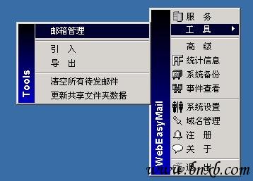 Web邮件服务器的工具管理如图4包括邮箱管理,邮件的导入和导出,及清空所有待发的邮件。