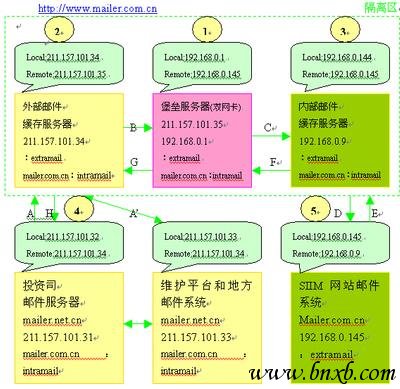堡垒主机模式不需要改动现有的网络配置,只需要在现有的一台IBM xServer232主机上装上双网卡即可实现硬件配置,邮件数据交换速度快(依赖于网络数据传输速度),基本上可以满足目前和未来3-5年内的使用要求。