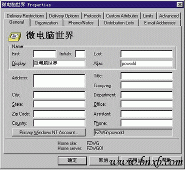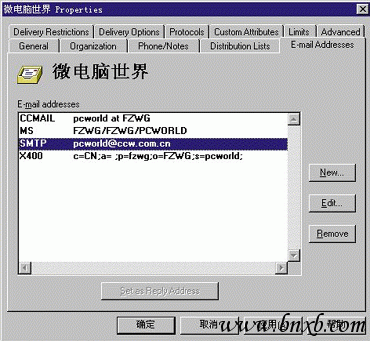 6.在"E-mail addresses"属性框中,我们可以查看用户的E-mail地址是否正确。Exchange Server自动为新用户映射了4种类型的地址,分别为CCMAIL地址、Microsoft Mail地址、SMTP地址和X.400地址。对于Internet邮件用户而言,应当查看SMTP地址是否映射为 [email protected]。如果不是,可以在这里进行修改,如图7所示。