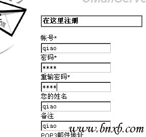 3.测试Webmail?在客户端浏览器地址栏里键入http://211.90.191.104:81,出现邮箱管理和申请邮箱的界面,现在单击sign up申请一个邮箱,只填入用户名和密码即可,其它也可不填,如图6。