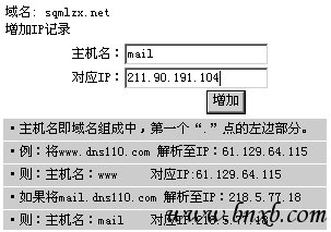 添加MX记录可以和域名提供商联系,让他为你代劳。比如单位的域名是sqmlzx.net,是www.dns110.com提供的,并由自己通过Web页面手动管理的。各个域名提供商的管理界面都是大同小异的。在此介绍一下设置经过,供读者参考。