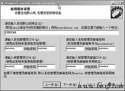 程序安装完毕后,自动进入设置向导。单击“下一步”按钮,即可进入“应用程序设置”窗口。在这里我们可以设置用户信箱的域名(即用户E-mail地址中@字符的后缀部分)和管理员口令。您可以向域名管理机构申请合法的域名。但是如果通信范围仅限于局域网内部,也可以通过内部的DNS服务器建立一个邮件服务器专用的域名。为叙述方便,我们使用了本机的机器名作为域名(在命令行窗口中键入“hostname”命令就能得到本机的机器名),本例中的机器名为CHHUIAN。然后设置系统管理员口令和邮箱密码以及域管理员口令和邮箱密码,以后在管理系统和域时会用到两个管理员口令(图1)。