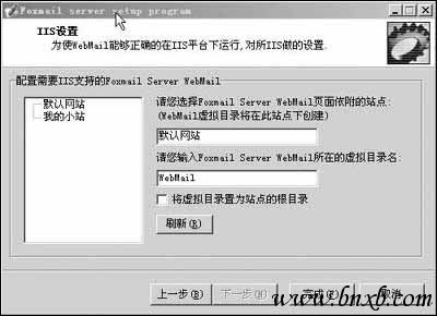 接着单击“下一步”按钮进入“IIS设置”窗口,可以通过设置IIS使FMS支持Webmail。为简化操作,我们选中“默认网站”作为Webmail所依附的站点,并采用默认的“Webmail”作为虚拟目录名。单击“完成”按钮,程序会自动对FMS进行配置,根据提示结束设置工作并重新启动服务器(图3)。