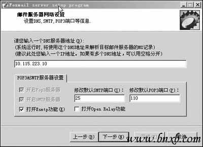 域名和管理员口令设置完成后,单击“下一步”按钮进入“网络设置”窗口。在这里可以设定DNS地址、SMTP端口、POP3端口等信息。DNS地址栏中应该填入当地电信部门或您所在的ISP提供的DNS地址,当然如果您只是在局域网内部通信且使用机器名作为域名,则只需填入服务器IP地址即可。本例中的DNS地址为本机IP地址“10.115.223.10”。SMTP端口和POP3端口应该采用默认参数,不过在这里可能会遇到SMTP端口或POP3端口被占用的问题。我们应按照提示停止某些程序对该端口的占用,并且保证以后在运行FMS时这些应用程序始终被关闭。该窗口最下边有一个关于Esmtp的可选项,这是一种身份认证功能,与客户端的“SMTP服务器需要身份认证”配合使用,可以杜绝垃圾邮件的侵袭(图2)。