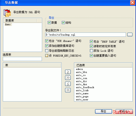 在导出到文件处填入你存入备份文件的路径和文件名,然后点导出,即可完成数据库的备份工作。
