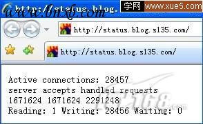 在3万并发连接下,访问Nginx 0.7.14 + PHP 5.2.6 (FastCGI) 服务器的PHP程序,仍然速度飞快。下图为Nginx的状态监控页面,显示的活动连接数为28457(关于Nginx的监控页配置,会在本文接下来所给出的Nginx配置文件中写明):