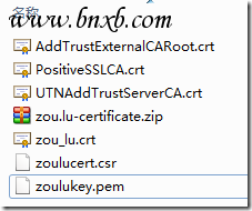 这里,zoulukey.pem 和 zoulucert.csr 是自己在 VPS 生成的,剩下的都是证书签发机构颁发的。