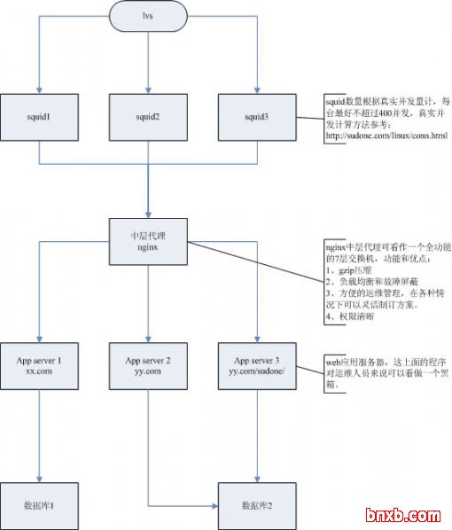 这个架构和app_squid架构的区别,也是关键点就是:加入了一级中层代理,中层代理的好处实在太多了: