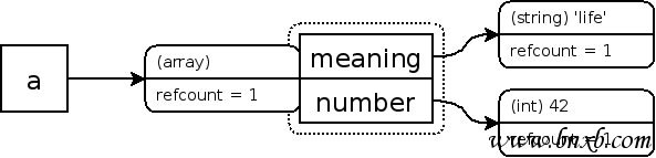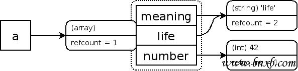 | a: (refcount=1,is_ref=0) = array( 'meaning'= >(refcount=2,is_ref=0) = 'life', 'number'=>(refcount=1,is_ref=0)=42, ) |