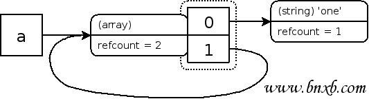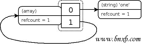 尽管现在已经没有一个任意作用域的符号指向这个结构,但是它的内存还是不能释放,因为数组元素”1” 一直指向同一数组, 因为已经没有任何外部符号指向它,所以用户没有任何方法来清除这个结构(memoryleak!!)这样你将得到一个内存泄露。 幸运的是,在页面请求结束时,PHP将会清除这个数据结构。但是之前,它讲一直在内存中占用空间,这种情况会在你实现了一个分析算法或者其他的子元素包含“父级“元素的时候常常发生,当然同样的情况也会在对象上发生那个,实际上大部分会在对象上发生。因为一个对象尝尝隐含的通过引用来使用。