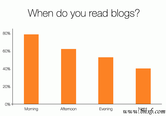 在对1400多名博客读者的调查中,大多数读者表示最习惯在上午查看自己关注的博客是否有新动态。之后的一天内随着时间向后推移,对博客的关注度递减。
