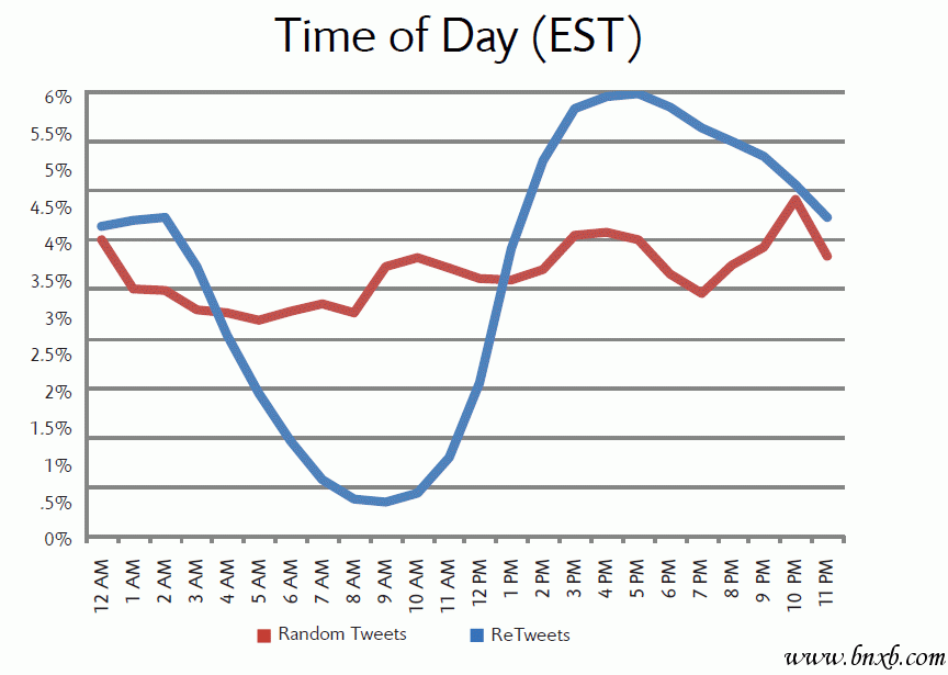 上图表明,Twitter用户通常在白天里进行tweet(在Twitter上发微博)时,白天的tweet量大于夜间。而转载tweet的行为在夜间发生的更为频繁,从图上可以看出,tweet转载量在凌晨四点时(美国东部时间)达到最高峰。