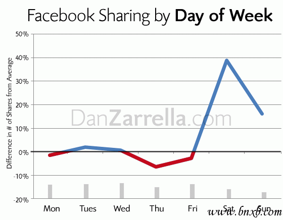 首先,尽管大多数新闻型网站和博客都在一周的工作日——周一至周五发布新闻/文章,但周六周日发布的文章更容易被facebook用户转载。造成这种现象的原因之一可能是,超过50%的美国公司在上班时间屏蔽了Facebook。