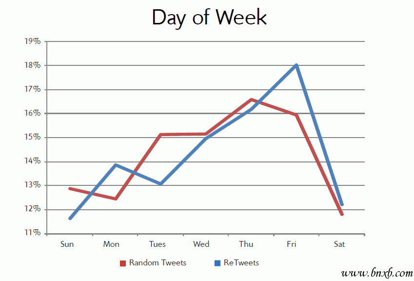 转载tweet的行为在一周的后半周(尤其是周五)发生的频率更高。