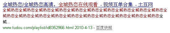 其实我自己对待关键字堆积,没有什么特别的看法,因为有时候你应该适可而止的去堆积,但是前提是尽量做到语句通顺,应该把搜索引擎当做来到你的网站的一个客户,尽量把好的内容展示给它,至于这个降权的关键字堆积应该就是属于,在描述中一直放任自己的关键字,在文章中也一直放着,这种形式就是你可以百度下“全城热恋在线观看”(是我刚刚百度的)第一页的最后一名,就是,大家可以当做一个例子看看。