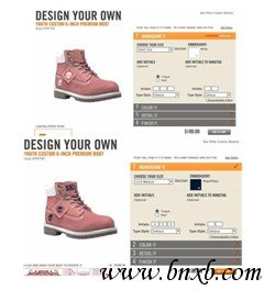 在网站的首页,消费者通过点击主页上的链接来设计自己的鞋子。消费者首先选择他们喜欢的鞋子或靴子的基本款式,然后选择其他要素,如尺码、颜色和细节(如针脚、鞋带和鞋底);另外,消费者还可以在鞋子上添加姓名的首字母。