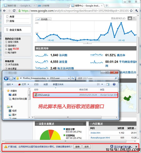 将下载的js脚本,拖入到谷歌浏览器窗口,在此过程中,谷歌浏览器会在底部提示是否继续,点击继续后,完成此脚本的安装!如果您需要将此脚本安装到火狐浏览器Firefox,请阅读我的博文 “ 谷歌分析(Google Analytics )应用扩展全攻略”,安装好Greasemonkey扩展后,即可正常使用此脚本。