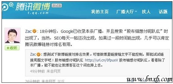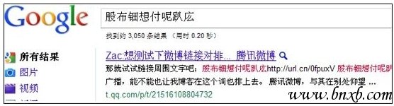 “试试链接周围文字吧:股布钿想付呢趴庅 http://url.cn/0fpuxV 股布钿想付呢趴庅,看看除了本广播,能不能也让我博客在这个词也排上去。”昝辉说:“18分钟后,Google已收录本条广播,并且搜索“股布钿想付呢趴庅”时出现了。”