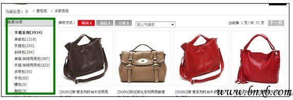 分类加上数字除了对用户友好外,对引擎来说也是友好的,我们看看单肩包(1218),它的链接地址是http://www.mbaobao.com/c-2/,是不变的链接,它的旁边数字是不断更新的,当蛛蛛来这里的时候就会爬到这就是栏目页更新点上。