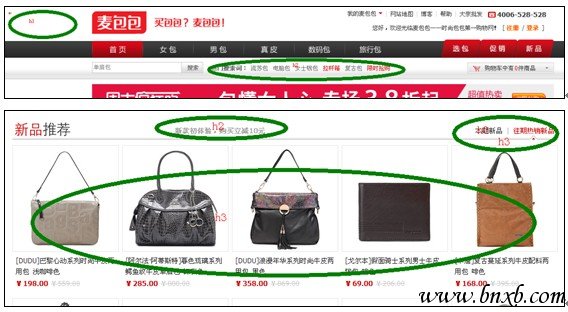 <h1 class="h1_siteinfo">麦包包</h1>分析:一个页面只有一个h1,样式标签名为h1_siteinfo加下横线,siteinfo是网站信息的意思,一个页面只能有一个h1,样式标签的更应该围绕英文意思,对其用“_”划分,做为代码的关键词划分。引擎只捉取客户端代码。