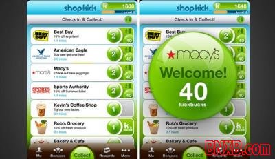 Shopkick改变了很多公司(诸如Best Buy、Target、Macy’s Wet Seal等)给顾客提供奖励和礼券的方法。Shopkick开发出了一种叫作Shopkick Signal的技术。只要你的手机下载了这个App,它就能让用户仅需走进商店就可以获得叫作Kickbucks的购物积分。