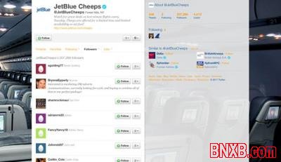 当JetBlue的社会化媒体策略师Morgan Johnston和他的同事被叫去讨论如何让他们的Twitter账号@JetBlueCheeps更受关注时,他们同时在Twitter上向他们的粉丝发布了这个讨论话题,并征求他们的意见。
