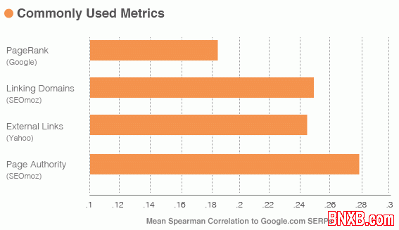 在SEOmoz这张图中,得出的相关系数多为是0.2~0.3左右的,这一般称为弱相关。这个数据说明在Google中,外链和网页排名之间的相关性并不是很大。