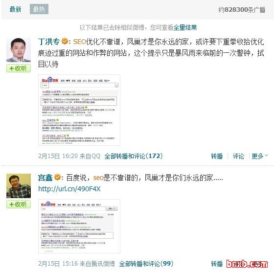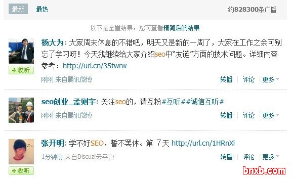 最热广播指的就是转播和评论数最多的广播。下图为搜索“seo”,最热广播的排名截图: